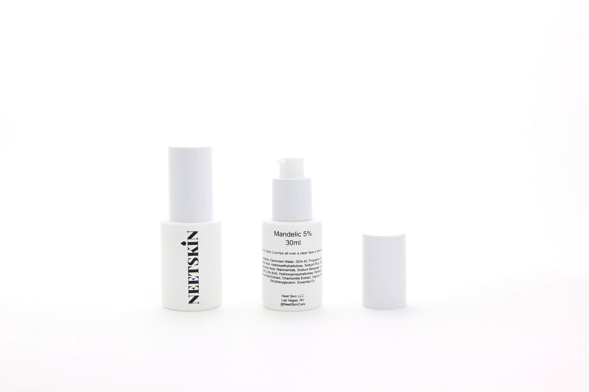 A specially formulated skin serum with a combination of Mandelic Acid 5% and Lactic Acid. These are powerful but gentle AHA’s that will help fight acne, improve skin texture, brighten skin while lightening dark spots and promote collagen production. This product also offers the added benefits of Hyaluronic Acid for hydration and Niacinamide, a form of Vitamin B3, to maintain the skin’s protective barrier, while both also help to reduce the appearance of fine lines and wrinkles.